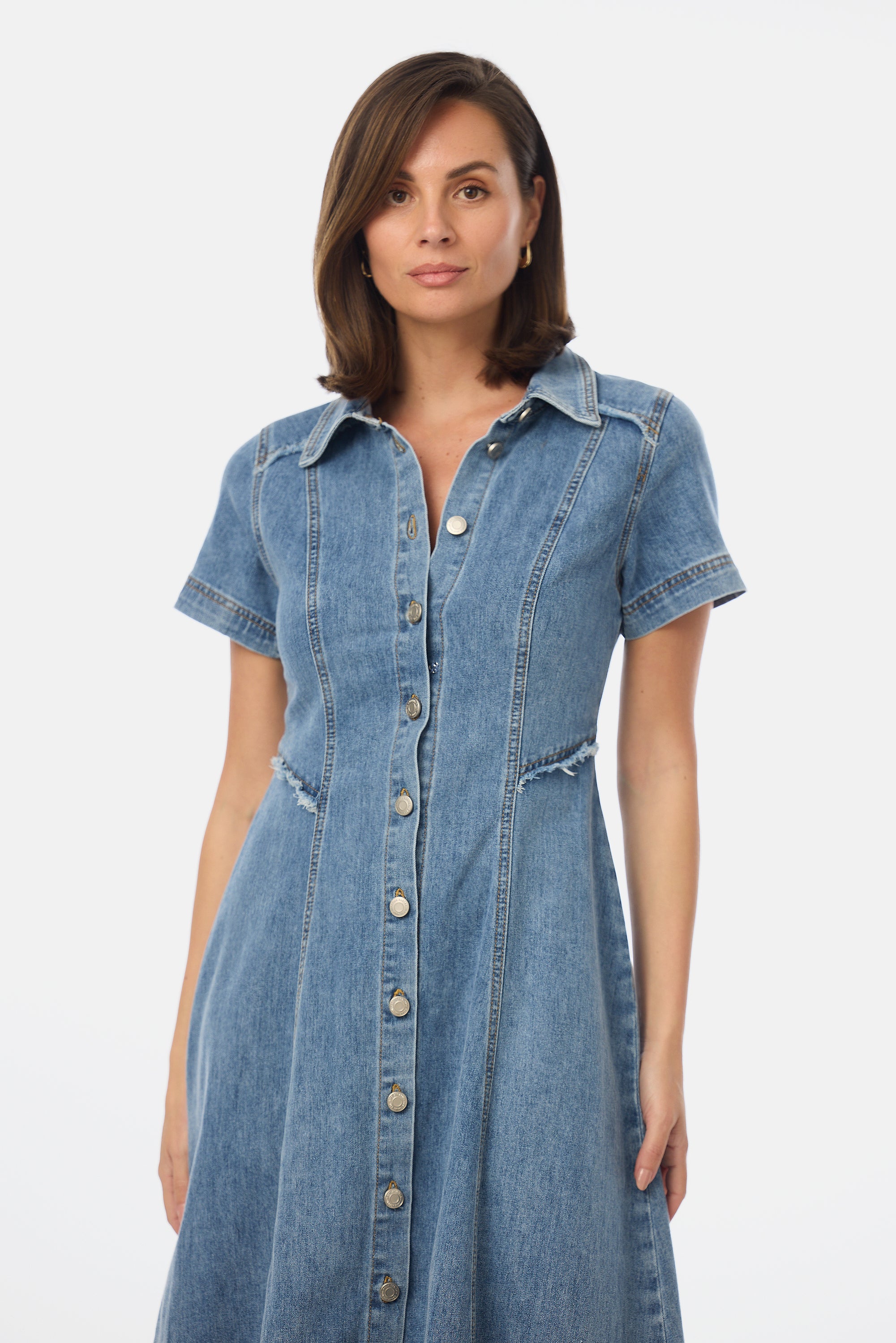 The Denim Short Sleeve Midi Dress in Mid Blue Wash brings a fresh spin to a much loved silhouette. Featuring a collared neckline, A-line silhouette, and soft fray detailing, this stretch-denim dress offers a polished look you can style from weekday to weekend.