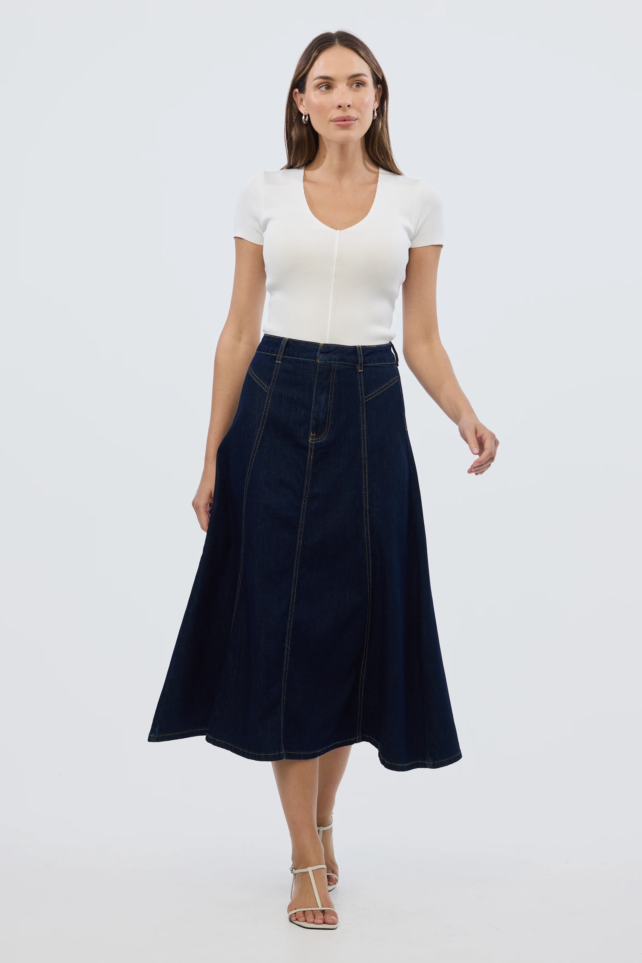 Classic meets comfort in the Denim Skirt in Indigo. Designed with a flattering A-line silhouette and soft stretch denim, this midi skirt is a reliable favourite. Detailed with topstitched seams and a fly front, it transitions effortlessly from casual days to smart-casual looks.