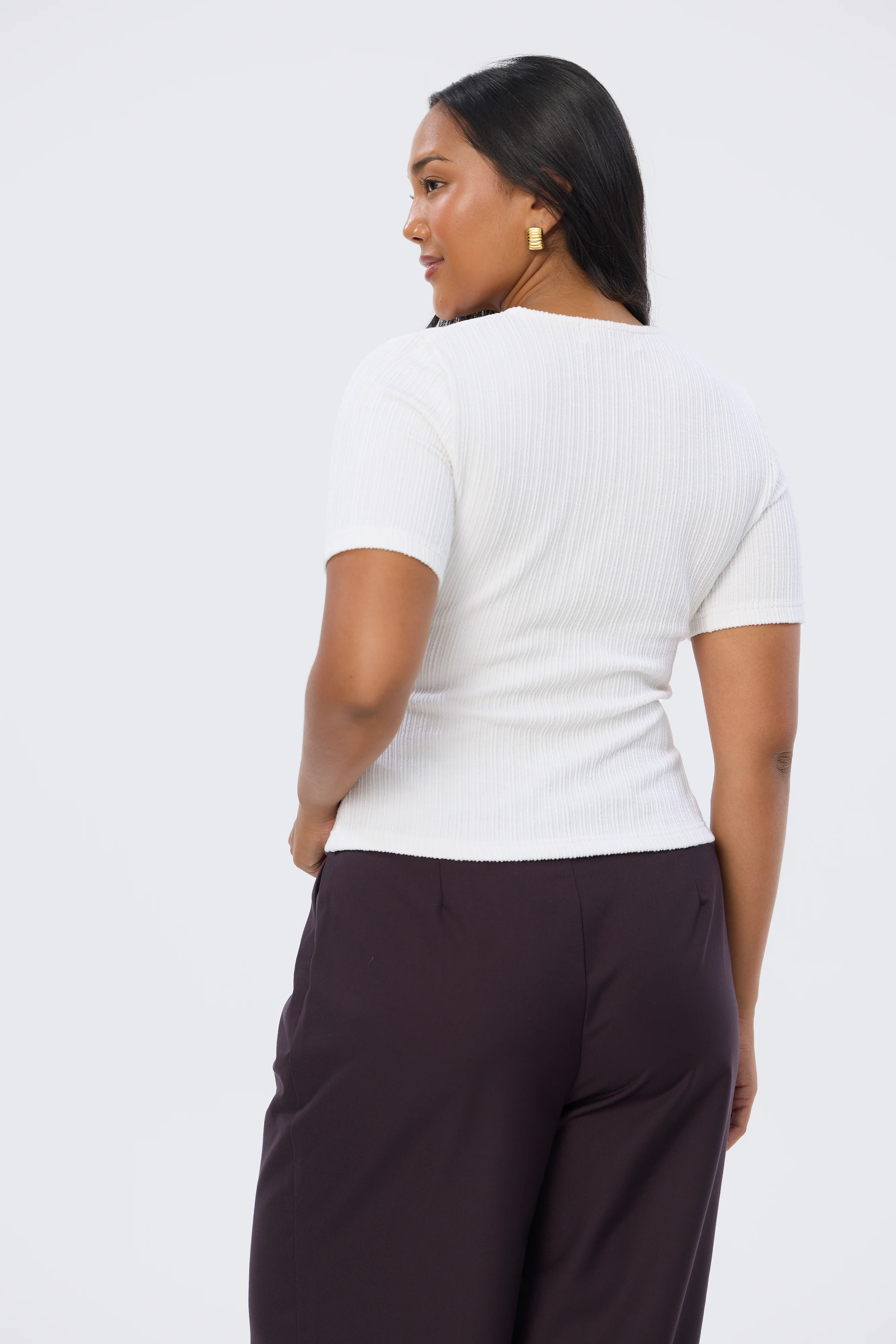 A wardrobe staple, the Gathered V-Neck Top in White is a fitted, regular-length style crafted from mid-weight rib stretch jersey. Featuring a flattering V-neckline, short sleeves, and a centre-front gathered seam, it offers subtle texture and effortless, all-day comfort.
