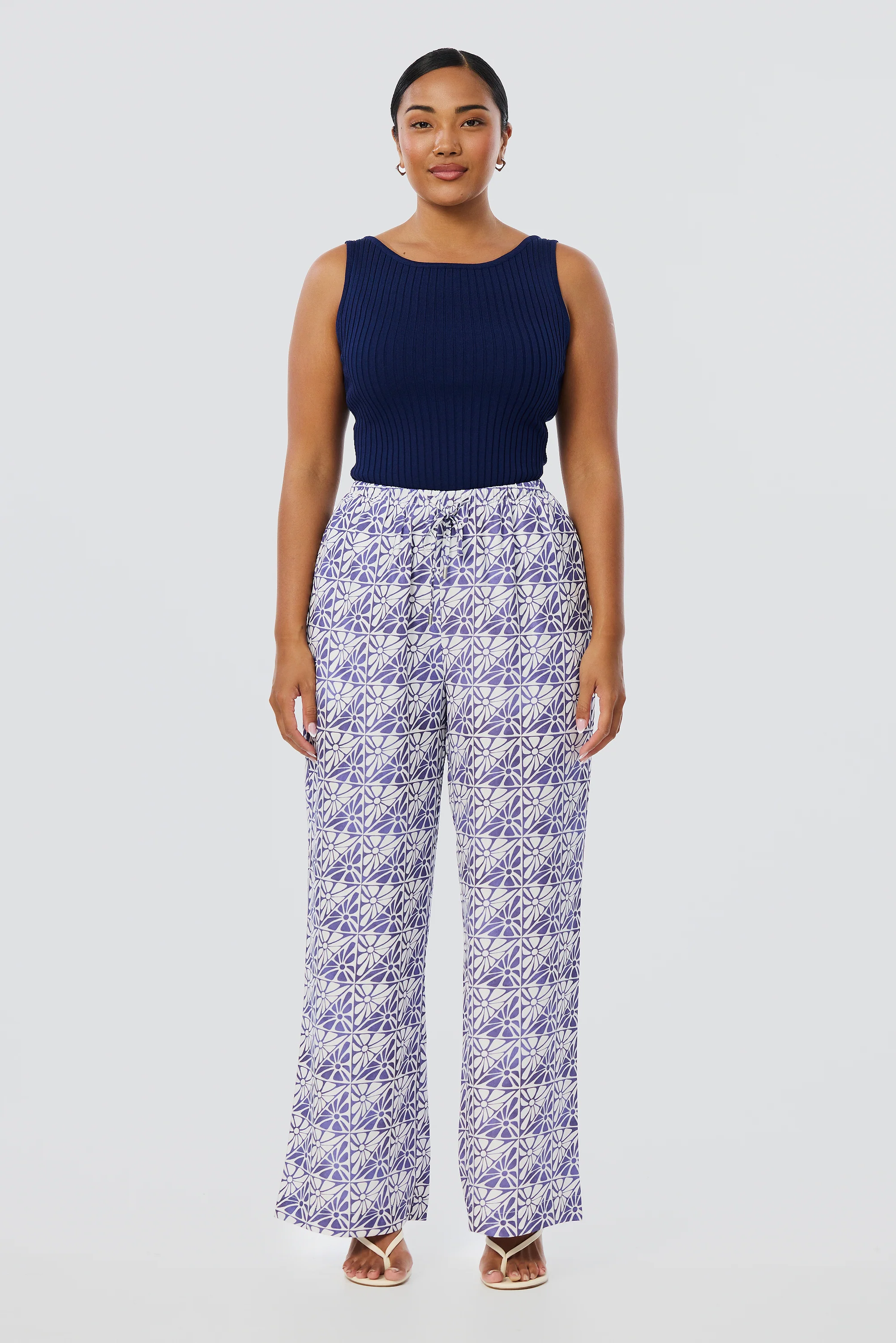 The Sleeveless Boat Neck Knit Top in Indigo Blue offers a polished foundation for effortless styling. Its fitted shape and mid-weight rib knit provide structure and comfort in equal measure.
