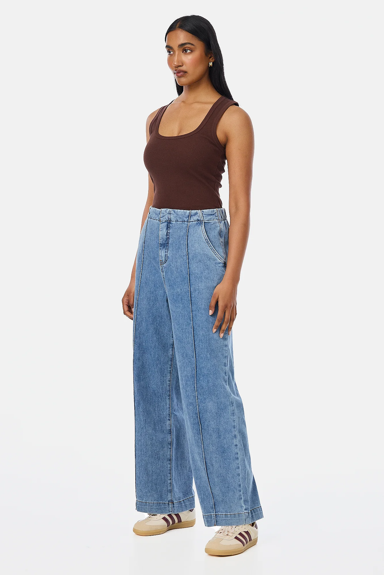 A classic denim wash meets elevated tailoring in the Tailored Pintuck Jeans in Mid Wash Blue. Designed for comfort and shape, they feature front leg pintucks, side elastic panels in the waistband, and a wide leg silhouette.
